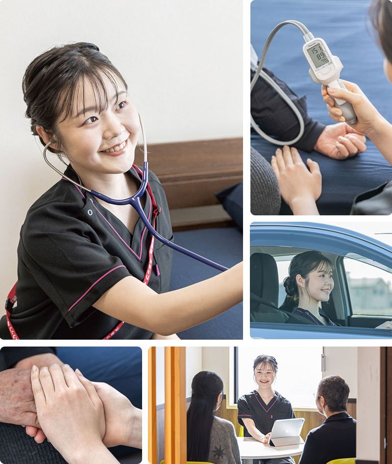 療養生活における不安や心配事がございましたら、どうぞご連絡ください。主治医やケアマネージャー等、多職種と密に連携をとり、看護師の立場からアセスメントし、適切なサービスを提供します。また、介護されるご家族の不安や心配事にも丁寧に答え、希望される暮らしが叶うよう支援していきます。